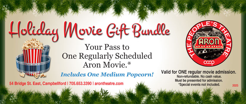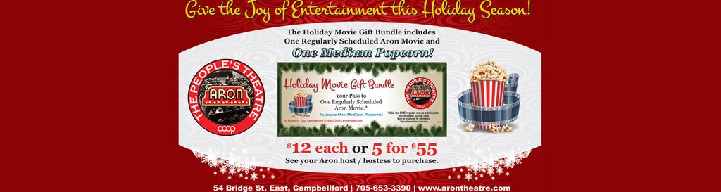 The Holiday Movie Gift Bundle includes one regularly scheduled Aron movie and one medium popcorn.